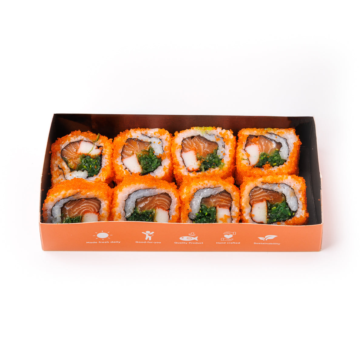 Freshly prepared by our Sushi Chefs, this Salmon & Ebiko (Capelin Roe) Maki Set is vibrant in colour and taste. Served with complimentary wasabi and shoyu.